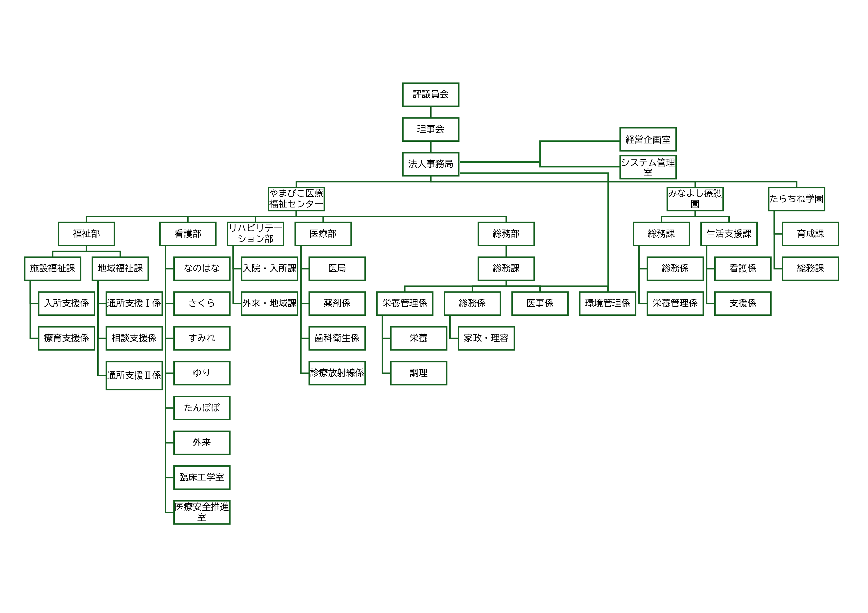 組織表ORGANIZATION CHART HOME 向陽会について 理事長挨拶 法人事務局 法人沿革・概要 組織表 法人パンフレット 施設案内 やまびこ医療福祉センター たらちね学園 みなよし療護園 デイサポート通所やまびこ 相談支援ステーションやまびこ 発達サポートるっか 情報公開 交通アクセス 向陽会 組織表